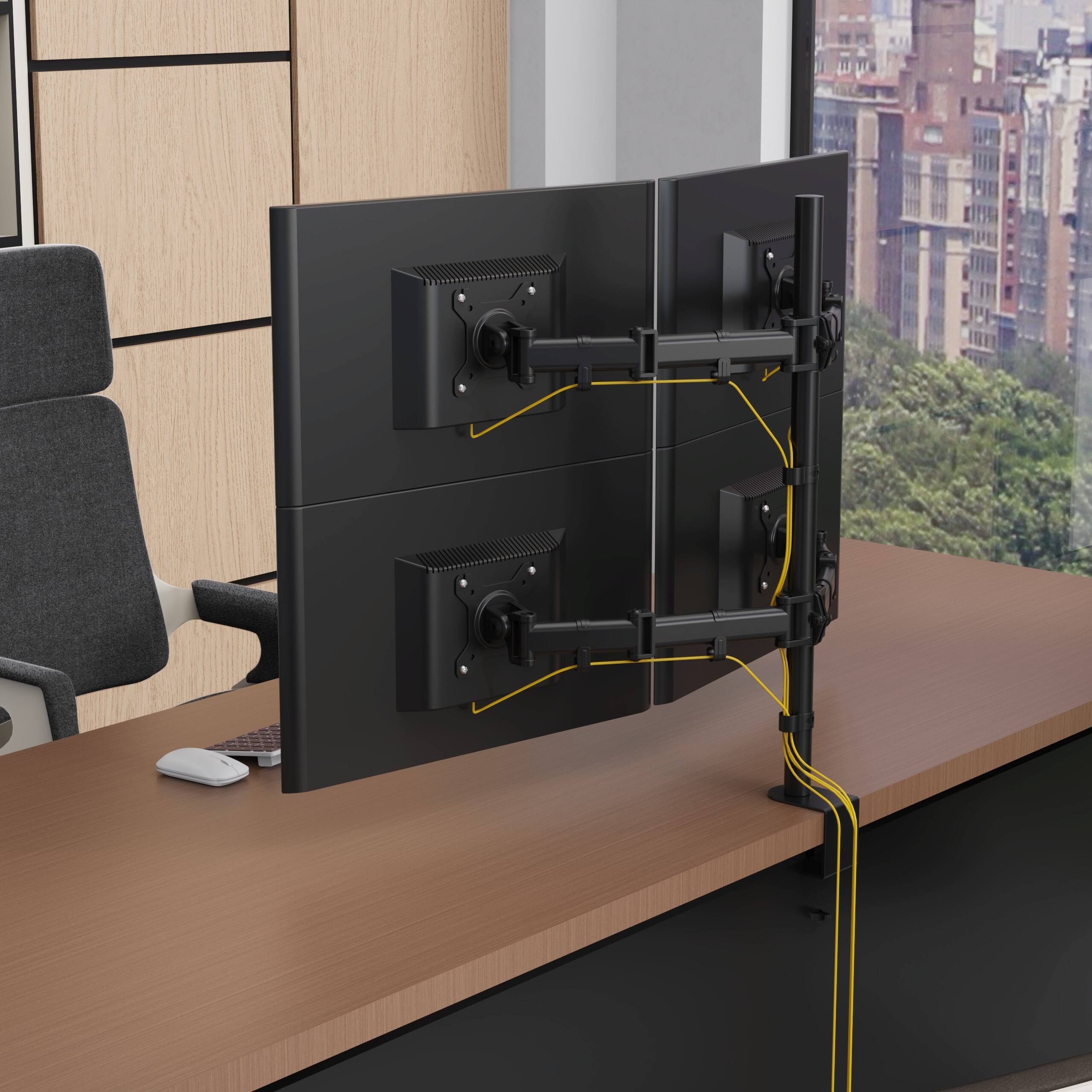 Designed to hold up to four monitors (13"–27") weighing up to 8kg (17.6 lbs) each, perfect for multitasking and immersive work setups.