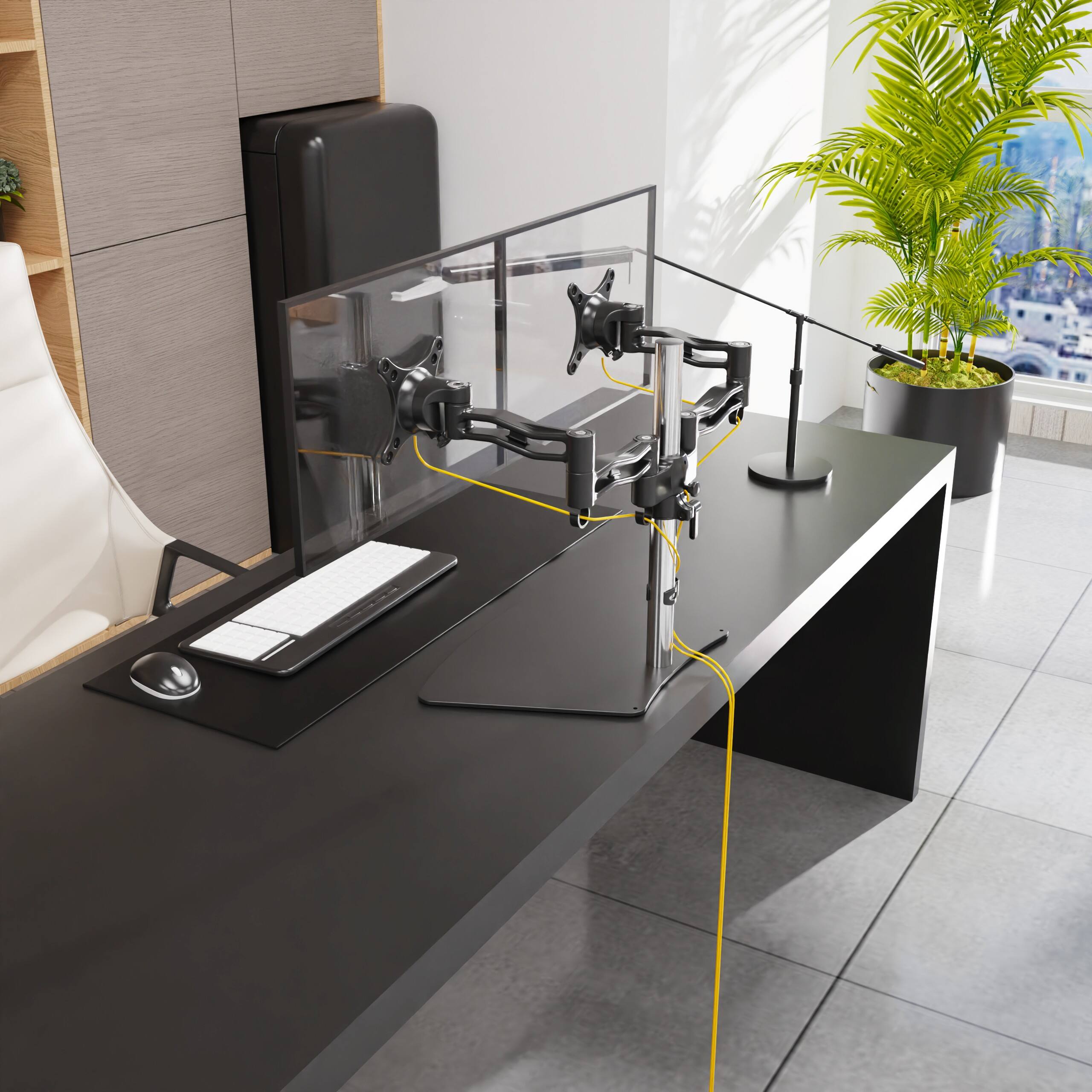 Stable dual monitor desk stand with cable routing, easy hex wrench adjustment, ergonomic design