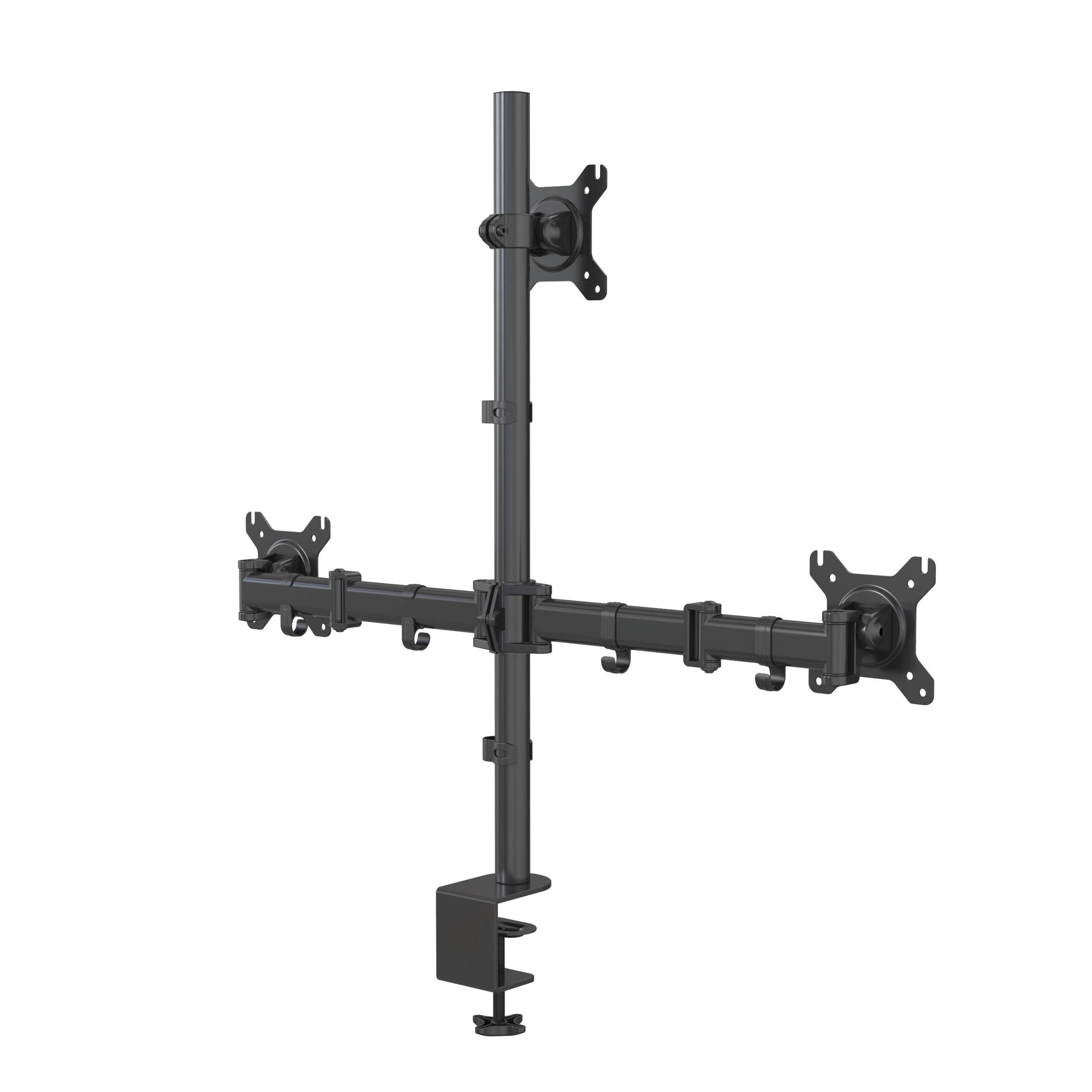 The extended vertical pole offers ample height adjustment for upper and lower monitor positioning, allowing comfortable stacked or curved setups.
