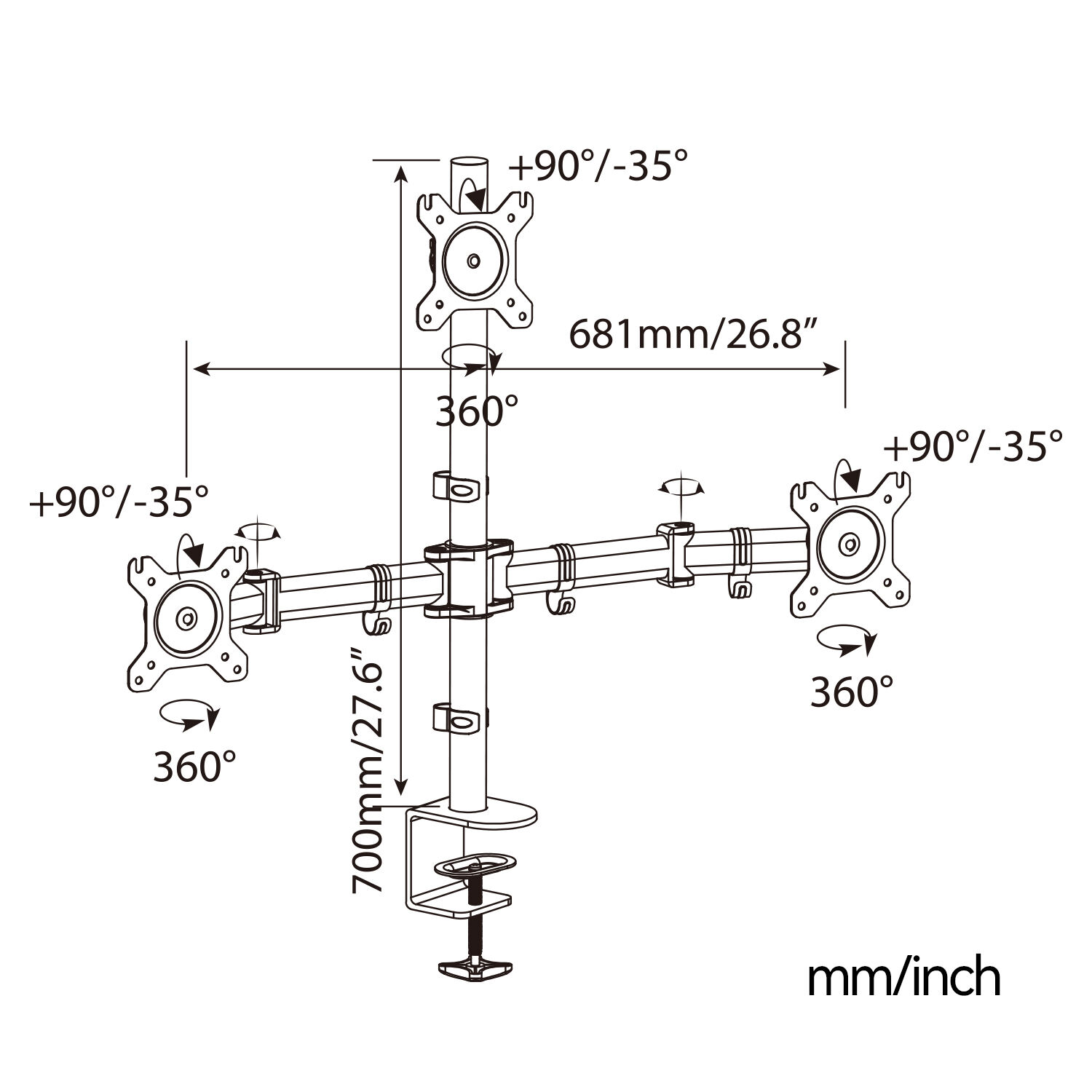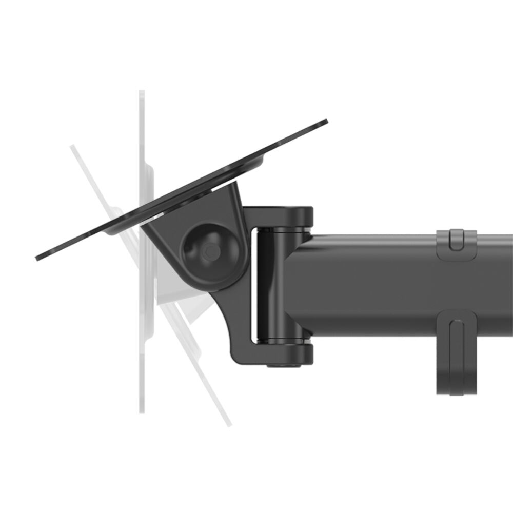 Each monitor arm supports tilt, swivel, and rotation: Upper arm tilt: +20° to -20° Lower arms tilt: +90° to -35° Horizontal swivel: 180° Panel rotation: 360° This provides maximum ergonomic flexibility.
