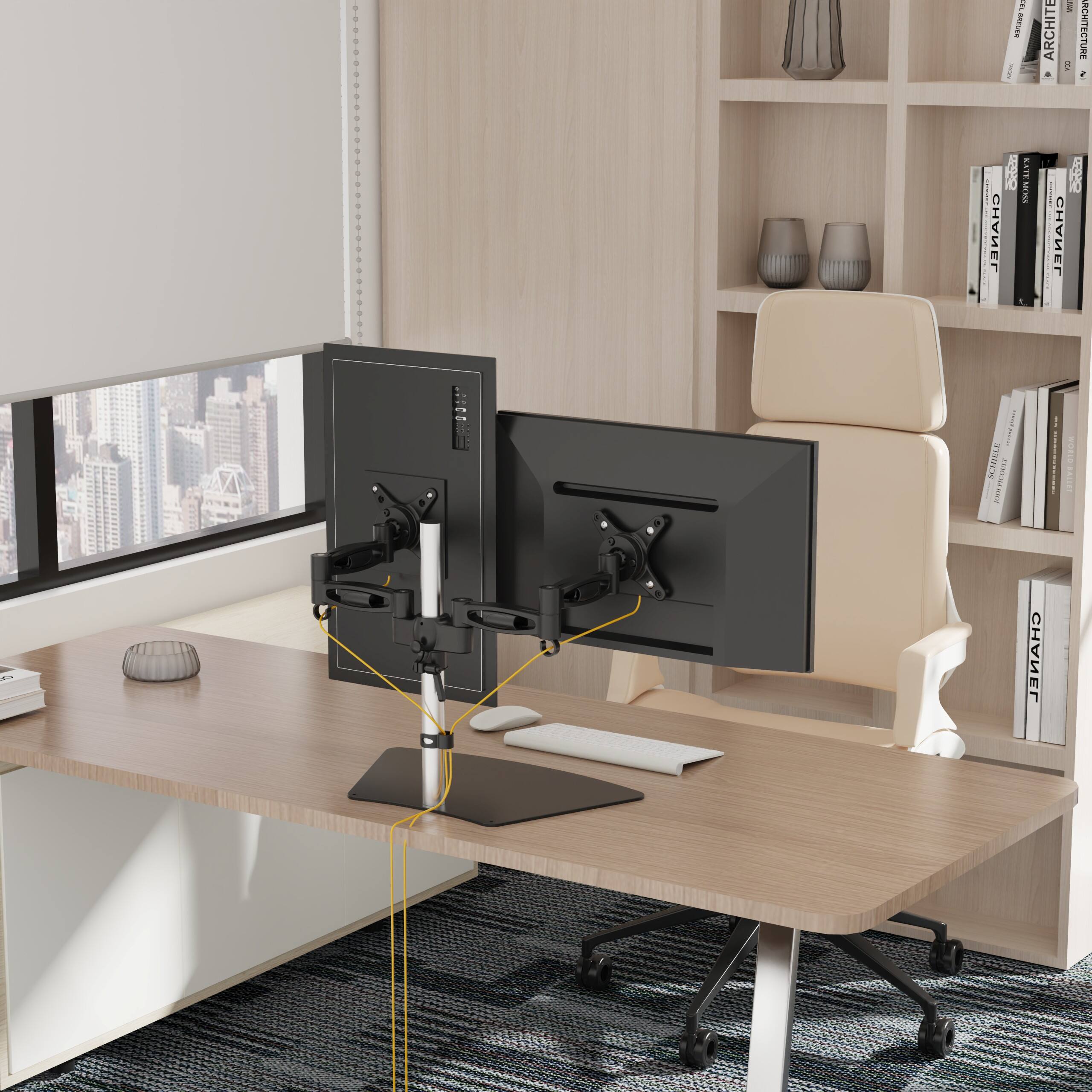 Sturdy steel dual monitor mount with cable management, easy hex wrench adjustment