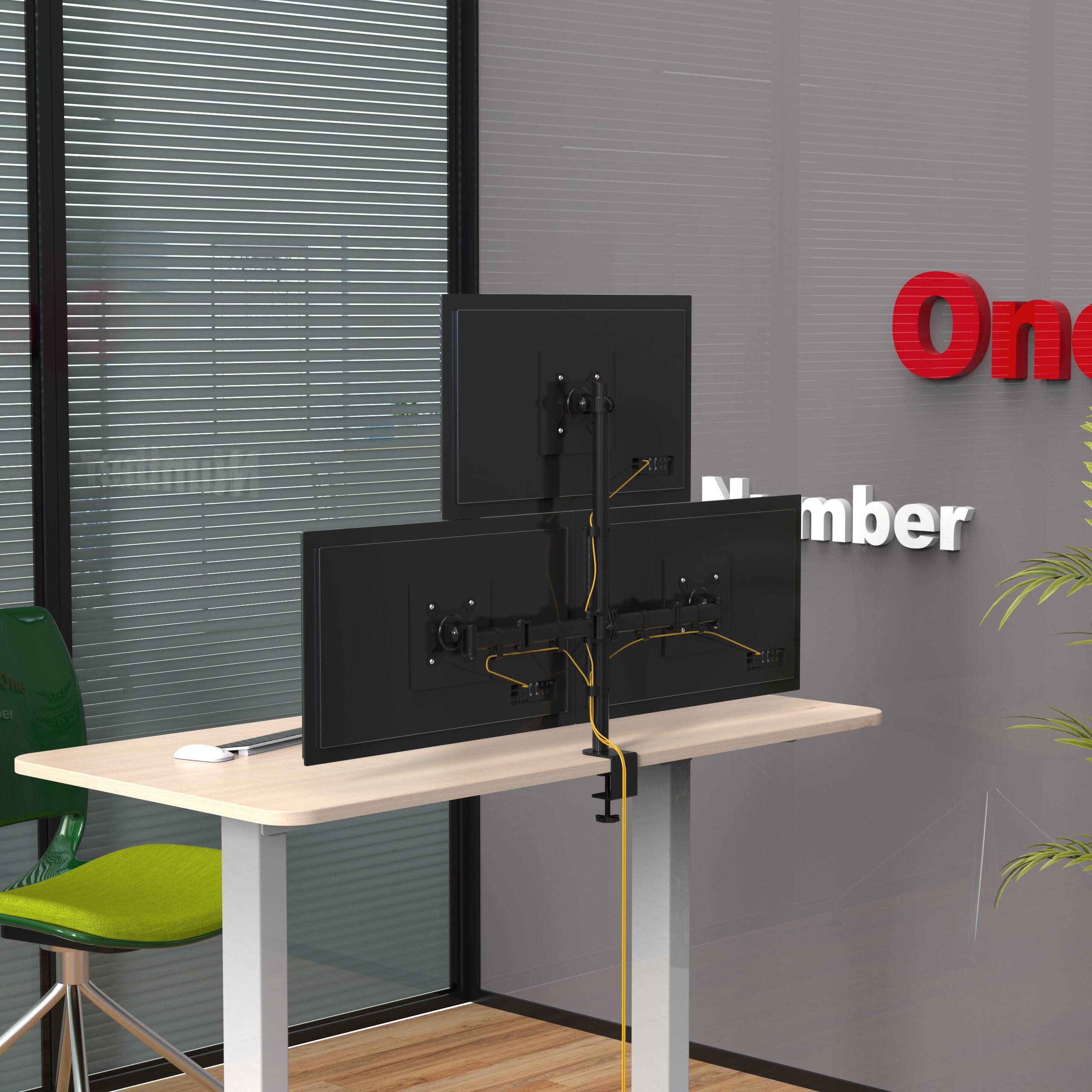 O poste vertical estendido oferece ampla regulagem de altura para posicionamento superior e inferior dos monitores, permitindo configurações empilhadas ou curvas com conforto.